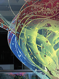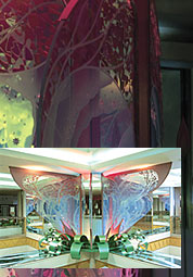 神戸 新長田ジョイプラザ 震災復興モニュメント 1999/4/1施工 H2400mm×W4650mm 総重量 3.5t (花びら)オパールガラス8mm フロートガラス8mm 合わせガラス/エッチング加工 一部着色 /表面 スワロフスキーランタンパーツ接着(めしべ)ミラー8mm 裏面エッチング 着色/表面下部 3分の1マット仕上げ(葉)スティール:メラミン焼き付け塗装(梁部)ミラー12mm 裏面エッチング+着色
