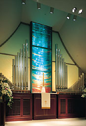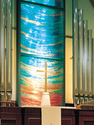 中野サンプラザチャペル 全体サイズ;H5220mm×W5600mm スクリーン 積層ガラス;H5220mm×W1200mm×D40mm フロートガラス8mm×15mm積層接着後、裏面サンドブラスト加工、着色 左右オパールガラススクリーン; H3700mm×W2200mm 2セット オパールガラス8mm、8mmフロートガラス合わせ加工 表面エッチング加工